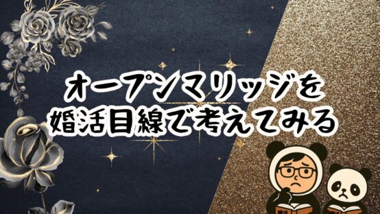 パンダのコラム オープンマリッジを婚活目線で考えてみる 本記事には広告リンク(プロモーション)が含まれていますおじパンダ&子パンダどうも、パンダです🐼最近、YouTuberヒカルさんの影響で「オープンマリッジ」が凄い話題になってるみたいだね。婚活ブロガーとしては乗るしかないよね、このビッグウェー... 2025.09.25 パンダのコラム